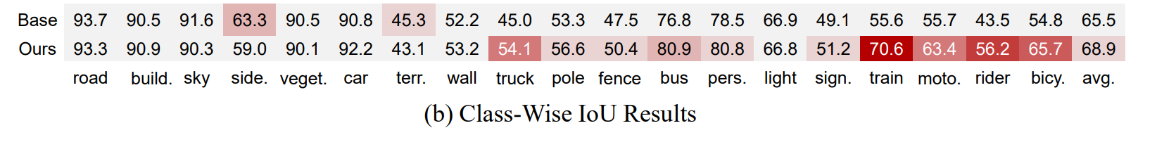 Class-wise IoU · 2-row heat-shaded comparison table