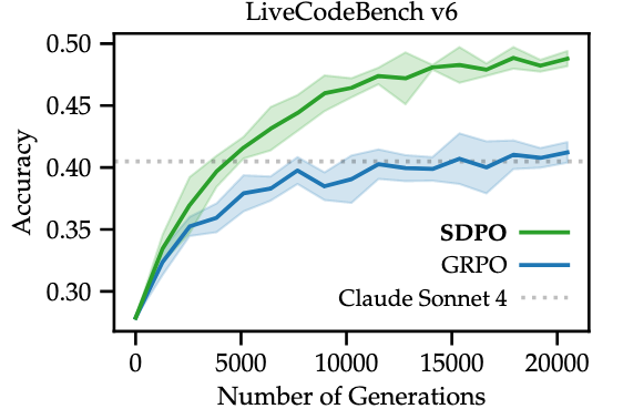 LiveCodeBench v6 上的连续训练曲线:SDPO(绿)vs GRPO(蓝),每条线下方配半透明置信区间(alpha≈0.20),上方是灰色点线 Claude 参考。LaTeX Computer Modern serif,四边框,刻度向内,无边框图例(主方法粗体)。同一脚本还会生成第二张 model scaling 图(见 line_selfdistill_scale 条目)。