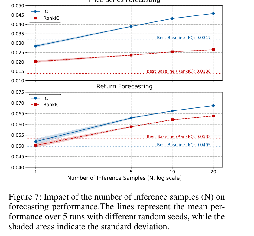 Kronos Figure 7 复现。两面板(Price Series Forecasting / Return Forecasting),IC(蓝实线圆点)与 RankIC(红虚线方块)随推理采样数 N(log 轴:1, 5, 10, 20)变化。浅色阴影为 5 个种子的 ±1 std,水平点状参考线标出最优非 Kronos 基线 IC / RankIC,配同色文字标注。