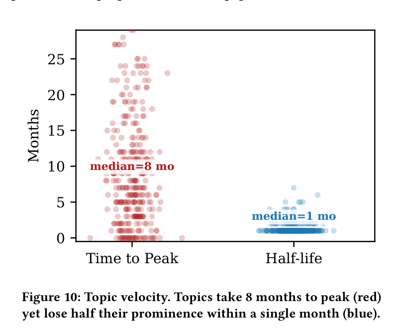 Reproduction of arXiv:2604.04562 Figure 10. Two horizontal strip / swarm columns (Time to Peak in red, Half-life in blue) of per-topic month counts. Points are jittered with low alpha to expose density; bold coloured median annotations are pinned next to the densest band of each column (median = 8 mo vs median = 1 mo).